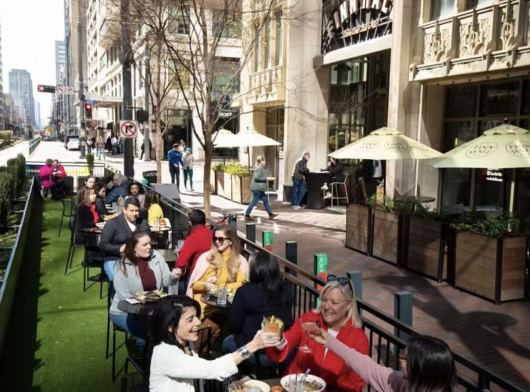 起因是2021年疫情。当时市中心餐饮业瘫痪,市政府临时封闭Main Street部分车道,允许餐馆把桌子摆到马路中间。