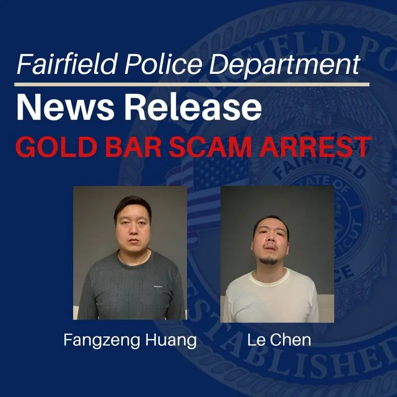 来自康乃狄克州费尔菲尔德市(Fairfield)的警方通报称,有两名华裔男子来自纽约,涉嫌通过“金条诈骗”(gold scam)的方式,骗取当地老年居民的财物,两起相关案件加起来,造成的损失已超过45万美元。目前,警方已对这两名男子发起指控,罪名包括串谋重大窃盗以及电话诈骗等。